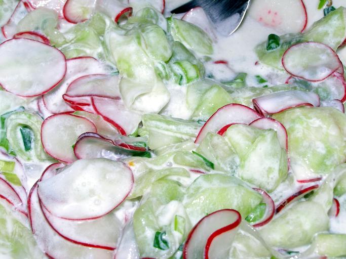 Keywords: eating pig iron mizeria cucumbers salad eat vegetables food closeup luncheon radish
