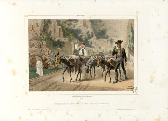 Keywords: Eaux-Chaudes - Transport de vin par les muletiers espagnols - Fonds Ancely - B315556101 A MONTAUT 021.jpg Titre calligraphié et illustré à l'encre sur feuille de calque Fait partie de deux albums réunis et publiés par F Sinnett à Paris Lith de Becquet frères à Paris Les planches du premier album ont été dessinées par Montaut et lithographiées par Bargue Les planches du second album ont été dessinées et lithographiées par Charles Maurice Le titre du premier album est lithographié Le premier album est signalé dans la bibliographie pyrénéiste de Jacques Labarère comme étant très rare Pièce jointe photocopie en n et b d'une lithographie de Montaut intitulée Col de Tortes - Traversée de la montagne Ancely René 1876 - 1966 Possesseur fre public domain domaine public B315556101_A_MONTAUT_021 jpg image/jpeg 1 f de pl lithogr ; 30 cm oblong Sinnet F Éditeur Becquet 18 - 18 ; imprimeur Lithographe http //numerique bibliotheque toulouse fr/collect/general/index/assoc//ark /74899/B315556101_A_MONTAUT_021 dir/B315556101_A_MONTAUT_021 jpg A-MONTAUT 18 http //catalogues toulouse fr/web2/tramp2 exe/do_keyword_search/log_in setting_key BMT1 servers 1home query p001745 vignette http //numerique bibliotheque toulouse fr/collect/general/index/assoc//ark /74899/B315556101_A_MONTAUT_021 dir/B315556101_A_MONTAUT_021_thumb jpeg by 1852 Eaux-Chaudes - Transport de vin par les muletiers espagnols B315556101_A_MONTAUT_021 woodblock print - lithography - engraving - colors - color lithograph Vallée d'Ossau Animal-powered transport in art French national costumes Containers in art Mountains of France in art Historical images of Pyrénées-Atlantiques Scarves in art |