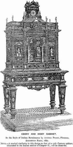 Keywords: Ebony and Ivory cabinet in the Style of Italian Renaissance by Andrea Picchi,Florence.jpg Uploaded with en wp UW marker 2012 06 18 Italian Cabinet present at the 1867 Paris Exhibition www gutenberg org/ebooks/12254 1893 Project Gutenberg's Illustrated History of Furniture by Frederick Litchfield http //www gutenberg org/files/12254/12254-h/12254-h htm http //www gutenberg org/etext/12254 PD-Old Category Illustrated History of Furniture Andrea Picchi born in Florence in 1823 was a well-known ebonist who framed works of art for special clients such as Grand Duchess Olga Nikolaevna Romanova for whom he framed a pair of tondi after paintings by Fra Angelico 15th century executed by Diomede della Bruna a Florentine painter born in 1839 He also framed for Umberto I and his wife Queen Margherita of Savoy two works by Tito Chelazzi an oil painting of daisies after the queen's name Margherita which means daisy and a mirror roses thea painted on glass the royal couple had comissioned from this painter he too a sought-after artist by European royal families After some years in Via della Vigna Nuova Picchi moved to Via Maggio 28 where he developped his artistry in carving ebony a dense yet fine textured black wood An example of his artistry is the frame firstly referred in this article Elaborate octagonal Baroque style frame with flame-carved border ebony with part-gilt bronze fittings and 16 set carnelians each as described in the 56th Hermann Historica Auction held in Munich 06-10 2008 But his masterpiece in carving would be the excepcionally beautiful ebony and ivory cabinet in the style of the Italian Renaissance Picchi presented in the 1867 Paris Exhibition though with a marked similarity in this design to that of a 17th century cabinet as Frederick Litchfiel points out in his History of Furniture In fact when comparing the pictures of the two cabinets in Litchfiel's book one may doubt if it is a mere coincidence or not Nevertheless Picchi's cabinet remains a jewel of carving and an example of mastering ivory and ebony Now in oblivion only his oval stamp on the verso of some ebony framed works of the 19th century calls out Andrea Picchi ebanista Via Maggio No 28 Firenze Historical images of Florence |