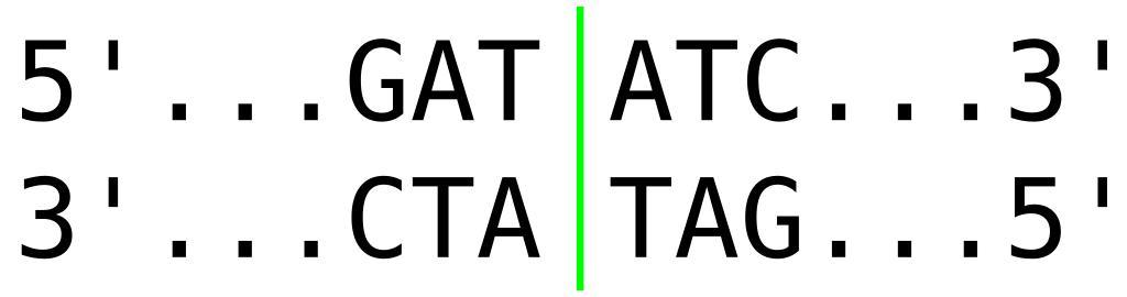 Keywords: EcoRV Restriction Site.rsh.svg This is the recognition sequence for the restriction endonuclease EcoRV The green vertical line represents the location where the enzyme cuts the double-stranded DNA helix In the case of EcoRV the cut is blunt leaving no overhanging ends Recognition sequence for restriction enzyme EcoRV Created with Inkscape 2007-01-15 Ramin Herati PD-self SVG genetics |