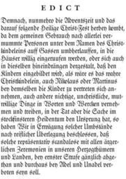 Keywords: Edikt Gustav-Adolf von Mecklenburg-Güstrow.gif Gustav Adolf vom 28 November 1682 Ingeborg Weber-Kellermann Das Weihnachtsfest - Eine Kultur und Sozialgeschichte der Weihnachtszeit Luzern u Frankfurt/M 1978 1682 Gustav Adolf Mecklenburg-Güstrow ;Text EDICT Demnach nunmehro die Adventszeit und das darauf folgende Heilige Christ-Fest herbey kombt da dem gemeinen Gebrauch nach allerlei vermummte Personen unter dem Namen des Christkindeleins auff Gassen umbherlauffen in die Häuser willig eingeruufen werden oder sich auch in dieselben hineindrängen dergestalt daß den Kindern eingebildet wird als wäre es das wahre Christkindelein auch Nikolaus oder Martinus bey demselben die Kinder zu vertreten sich annehmen auch andere nichtige unchristliche mutwillige Dinge in Worten und Wercken vernehmen und treiben in der Tat aber die Sache im stockfinsteren Heidentum den Ursprung hat so haben Wir in Erwägung solcher Umbstände nach reiflicher à berlegung beschlossen daß solche repräsentativ scandalose mit allen ärgerlichen Zeremonien in unseren Herzogthümern und Landen bey ernster Strafe gänzlich abgethan und durchaus bey Adel und Unadel verboten seyn soll PD-old-100 Original upload log page de wikipedia Edikt_Gustav-Adolf_von_Mecklenburg-G C3 BCstrow gif 2008-03-11 00 54 Fifat 300×425× 24351 bytes <nowiki> Information Edikt des Herzogs Gustav Adolf Mecklenburg-Güstrow vom 28 November 1682 Ingeborg Weber-Kellermann Das Weihnachtsfest - Eine Kultur und Sozialgeschichte der Weihnachtszeit Luzern u Frankfurt/M 1978 Urheb</nowiki> Documents associated with Mecklenburg Advent History of Mecklenburg Mecklenburg-Vorpommern in the 1680s |