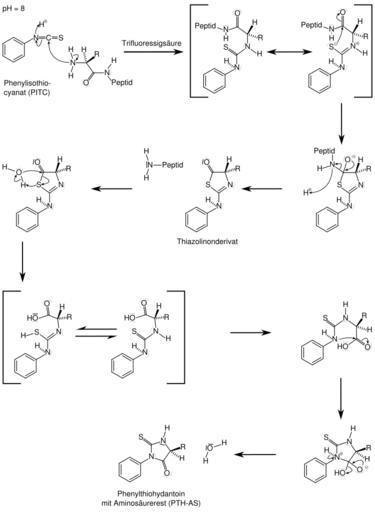Keywords: Edman degradation (German).svg Detailed reaction mechanism of the Edman degradation; created with BKchem and Inkscape Own 2008-05-13 Kreuvf Other fields + Edman degradation Reaction mechanisms