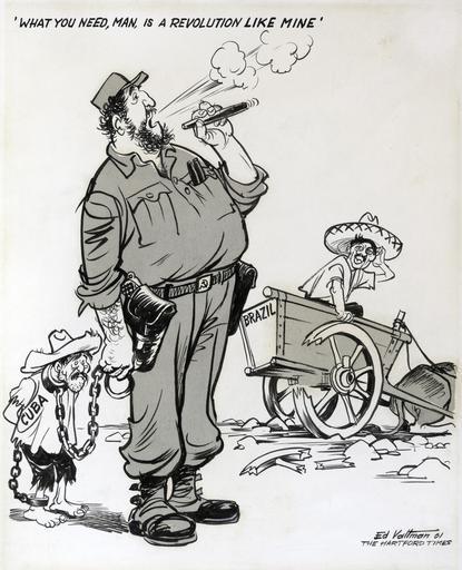 Keywords: Edmund S. Valtman, What you need is a revolution like mine ppmsca.02969.jpg en What you need man is a revolution like mine Valtman portrays Fidel Castro 1927- towering above small figures who represent Cuba and Brazil As Castro advises Brazil to have a communist revolution like the one he led Brazil looks back at the Cuban leader in puzzlement perhaps pondering the fate of Cuba in rags and chains Shortages of food and consumer goods were reported in the island nation in late August at the time that Valtman made this drawing At the same time Brazil was facing the economic challenge of debt and a crisis of leadership when Pres Jânio Quadros resigned on August 25th Though Latin American countries that desired social reform initially regarded Castro with sympathy Valtman seems to suggest that Brazil has come to view his example with skepticism LOC-image ppmsca 02969 Edmund S Valtman 1961-08-31 Gifted to the U S Library of Congress by Edmund S Valtman No restrictions of usage according to http //www loc gov/rr/print/res/384_valt html Edmund S Valtman Edmund S Valtman Caricatures of Fidel Castro Personifications of Cuba |