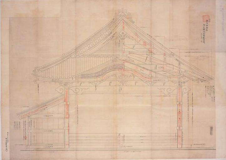 Keywords: Edo Castle Nishinomaru pic 03.jpg Example of a doorway at the Nishinomaru Palace of Edo Castle The details of the measurements are given in the drawing such as the width between the pillars being approximately 8 m height of the eaves is approximately 5 m 江戸西丸仮御殿御玄関御正 建 割但十分 ノ割 甲良筑前棟全控 元治度 写 請求記号: 6171-32 http //www library metro tokyo jp/17/024/17300 html 1864 unknown pd-art Nishinomaru Edo Castle |