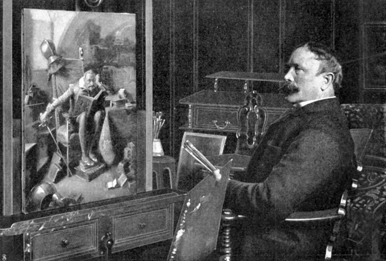 Keywords: Eduard Grützner.jpg de Eduard Grützner vor seinem Gemälde Don Quixote Die Gartenlaube Illustriertes Familienblatt Jahrgang 1904 2 Beilage zu Nr 13 S 3 author 1904 pd-old Eduard von Grützner Don Quixote in art Gartenlaube 1904
