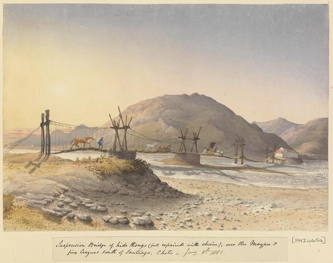 Keywords: Edward Gennys Fanshawe, Suspension Bridge of hide thongs (but repaired with chain) over the Maypu, five leagues south of Santiago, Chile, Jany 11th 1851.jpg en 'Suspension Bridge of hide thongs but repaired with chain over the Maypu five leagues south of Santiago Chile Jany 11th 1851' http //collections rmg co uk/collections/objects/154594 html 1851-01-11 Admiral Edward Fanshawe Edward Gennys Fanshawe 1814 11 27 1906 10 21 PD-Art-100 Edward Gennys Fanshawe 1851 watercolor paintings Landscape paintings of Chile Chile in the 1850s MaipĂș Paintings in the National Maritime Museum London Watercolor paintings of landscapes Bridges in art Suspension bridges in Chile |