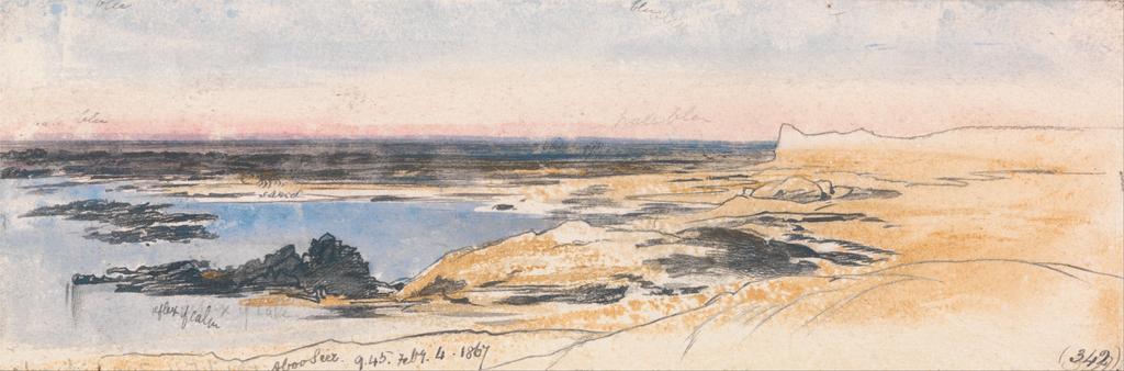 Keywords: Edward Lear - Abu Seer - Google Art Project.jpg inscribed in dark blue ink lower left Abooseer 9 45 Feby 4 1867 ; in dark blue ink lower right\ 342 ; Verso in graphite center 87 Longwise upper right ; in graphite upper right 212 Not on View Watercolor with pen in dark blue ink over graphite on moderately thick rough cream wove paper sky sand rocks water river riverbank landscape special url_id aAERxK2QEBlJHg PD-old-100-1923 1888 Egypt by Edward Lear Abusir Google Art Project works by Edward Lear |