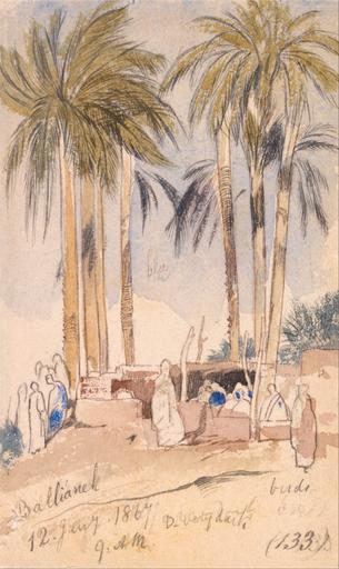 Keywords: Edward Lear - Ballianeh - Google Art Project.jpg inscribed in gray ink lower left Ballianeh 12 Jany 1867 9 AM ; in gray ink lower right 133 Not on View Watercolor with pen in brown and gray ink on moderately thick slightly textured cream wove paper palm trees sand figures representations landscape special url_id tQHNaThizy8WOA PD-old-100-1923 1888 Egypt by Edward Lear Google Art Project works by Edward Lear |