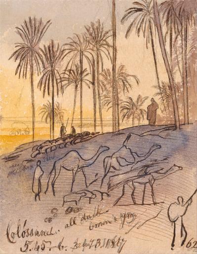 | Keywords: Edward Lear - Colósaneh, 5-45 - 6-00 p.m., January 3, 1867 (62) - Google Art Project.jpg inscribed in brown ink lower left Colossaneh 5 45-6 Jany 3 1867 ; in brown ink lower right 62 ; Verso in graphite upper left 12 up Top ; in graphite upper right 76 Not on View Watercolor witih pen in brown ink over graphite on moderately thick rough cream wove paper sky camels mammals palm trees figures representations genre subject special url_id WQG2JLsO6ng0YQ PD-old-100-1923 1888 Egypt by Edward Lear Google Art Project works by Edward Lear |