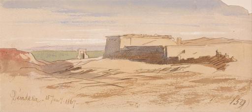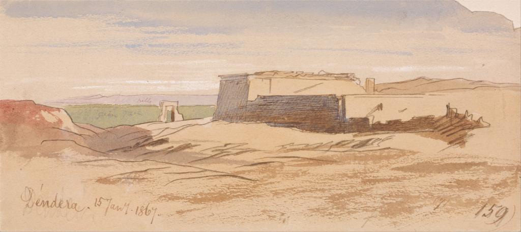 | Keywords: Edward Lear - Dendera - Google Art Project (2415537).jpg inscribed in brown ink lower left Dedera 15 Jany 1867 ; inscribed in brown ink lower right 159 ; Verso in graphite center 136 Not on View Watercolor with pen in brown ink over graphite on moderately thick moderately textured wove paper mounted on moderately thick moderately textured cream wove paper architectural subject sky sand temple ruins river landscape desert special url_id eQG9UzOVFWuRdA PD-old-100-1923 1888 Egypt by Edward Lear Dendera Google Art Project works by Edward Lear |