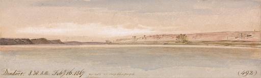 Keywords: Edward Lear - Dendour - Google Art Project.jpg inscribed in brown ink lower left Dendoor 8 30 AM Feby 16 1867 far hills xx deep blue purple ; in brown ink lower right 492 ; Verso in graphite upper left 133 up Lowest ; in graphite upper right 266 Not on View Watercolor wiht pen in brown ink and gouache over graphite on thick moderately textured beige wove paper architectural subject sky palm trees water temple riverbank buildings landscape special url_id MwGKVy68LBOJSg PD-old-100-1923 1888 Egypt by Edward Lear Nile in art Google Art Project works by Edward Lear Dendur |