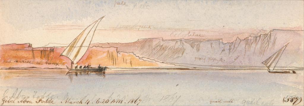 Keywords: Edward Lear - Gebel Abu Fodde - Google Art Project.jpg inscribed in brown ink lower left Gebel Abou Fodde March 4 6 20AM 1867 ; in brown ink lower right 587 Not on View Watercolor with pen in brown ink over graphite on thick rough cream wove paper mounted on very thick slightly textured white wove paper sky water cliffs river sails figures representations landscape marine art boats special url_id dgH1ZpSksa1ppA PD-old-100-1923 1888 Egypt by Edward Lear Nile in art Google Art Project works by Edward Lear Egyptian feluccas in art |