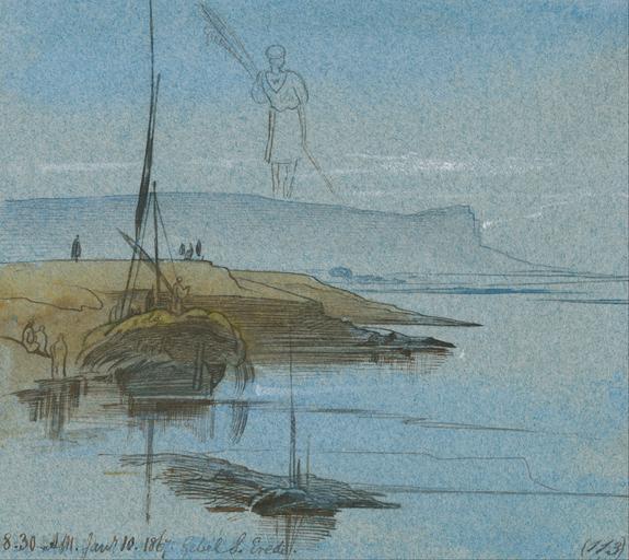 | Keywords: Edward Lear - Gebel Sheikh Eredi - Google Art Project.jpg inscribed in brown ink lower left 8 30 AM Jany 10 1867 Gebel S Eredi ; in brown ink lowr right 113 ; Verso in graphite center 27 up middle left Not on View Watercolor with brown ink and white gouache over graphite on moderately thick moderately textured blue wove paper water river riverbank study visual work figures representations genre subject boat special url_id oQFfueo0G0ntWQ PD-old-100-1923 1888 Egypt by Edward Lear Nile in art Google Art Project works by Edward Lear Egyptian feluccas in art |