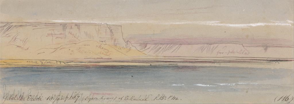 | Keywords: Edward Lear - Gebel Sheikh Eredi, (pigeon house of Er Raineh) - Google Art Project.jpg inscribed in brown ink over graphite lower left Gebel Skh Eredi 10 Jany 1867 Pigeon house of Er Raineh 1 15 PM ; in brown ink lower right 116 ; Verso in graphite center 27 up Lowest Not on View Watercolor with pen in brown and cochineal over graphite with white gouache on moderately thick slightly textured beige wove paper sky water cliffs river landscape special url_id 6gHYPd94HwE4wQ PD-old-100-1923 1888 Egypt by Edward Lear Nile in art Google Art Project works by Edward Lear Dovecotes in Egypt |