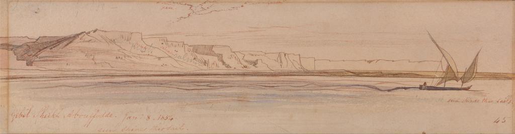 Keywords: Edward Lear - Gebel Sheikh Abu Fodde - Google Art Project.jpg inscribed in red brown ink lower left Gebel Sheikh Aboussodde Jany 8 1854 sun shines thru sail ; in brown red ink lower right 45 ; Verso inscribed in brown ink center 9 next below uppermost Not on View Watercolor with pen in brown ink over graphite on moderately thick moderately textured beige wove paper sky water river riverbank sails landscape boat special url_id eQFlXVyyA4Qm7w PD-old-100-1923 1888 Egypt by Edward Lear Nile in art Google Art Project works by Edward Lear 1854 in Egypt Egyptian feluccas in art |