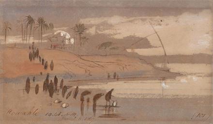 Keywords: Edward Lear - Howatke - Google Art Project (2412853).jpg inscribed in brown ink lower left Howakte 10 45 AM Jany 8 1867 ; in brown ink lower right 101 ; Verso in graphite upper left 25 up Top Not on View Watercolor with pen in brown ink and gouache over graphite on moderately thick slightly textured beige wove paper palm trees sand water riverbank figures representations landscape boat special url_id FwFhiMN9EXC6ow PD-old-100-1923 1888 Egypt by Edward Lear Google Art Project works by Edward Lear |