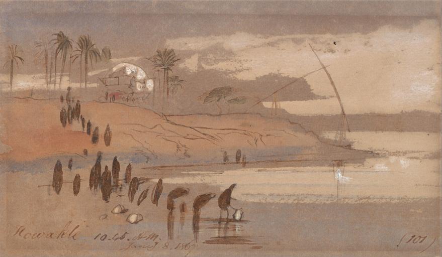 | Keywords: Edward Lear - Howatke - Google Art Project (2412853).jpg inscribed in brown ink lower left Howakte 10 45 AM Jany 8 1867 ; in brown ink lower right 101 ; Verso in graphite upper left 25 up Top Not on View Watercolor with pen in brown ink and gouache over graphite on moderately thick slightly textured beige wove paper palm trees sand water riverbank figures representations landscape boat special url_id FwFhiMN9EXC6ow PD-old-100-1923 1888 Egypt by Edward Lear Google Art Project works by Edward Lear |