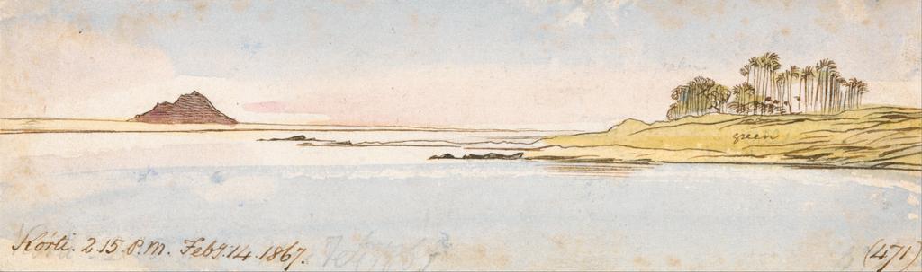 Keywords: Edward Lear - Korti - Google Art Project.jpg inscribed in brown ink lower left Korti 2 15 PM Feby 14 1867 ; in brown ink lower right 471 Not on View Watercolor with pen in brown ink over graphite on medium slightly textured wove paper mounted on moderately thick moderately textured cream wove paper sky palm trees water river riverbank hill landscape special url_id XwFjnWY19i-MaQ PD-old-100-1923 1888 Paintings by Edward Lear Google Art Project works by Edward Lear Historical images of Sudan