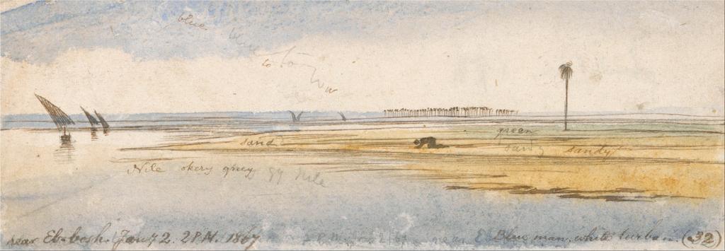 | Keywords: Edward Lear - Near Eb-bosh - Google Art Project.jpg inscribed in brown ink lower left; Near Eb bosh Jany 2 2PM 1867 ; in brown ink lower right blue man white turban 32 Not on View Watercolor with pen in brown ink over graphite on medium slightly textured wove paper mounted on moderately thick moderately textured cream wove paper palm trees water river sails figure representation landscape marine art boats special url_id gQGhnp5Hr5ctyw PD-old-100-1923 1888 Egypt by Edward Lear Google Art Project works by Edward Lear Egyptian feluccas in art |