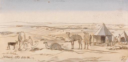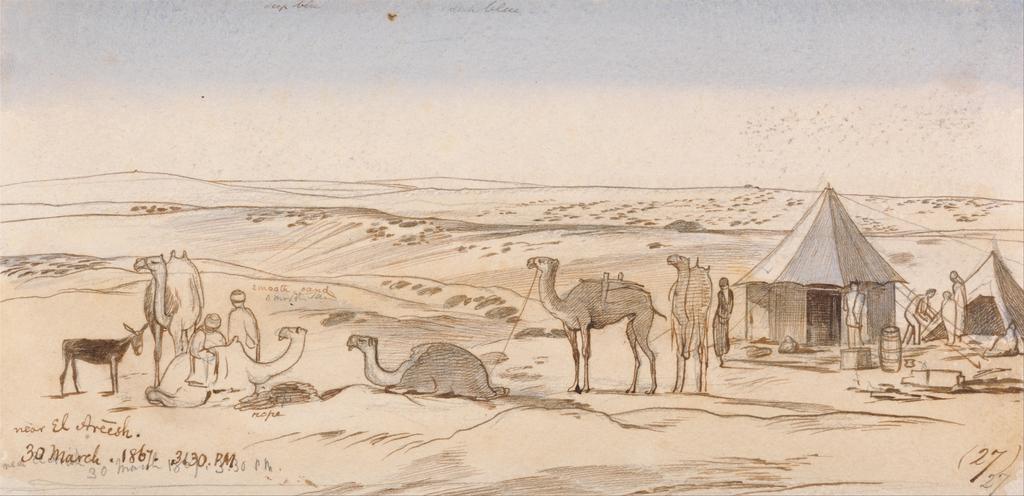 | Keywords: Edward Lear - Near El Areesh, 3-30 pm, 30 March 1867 (27) - Google Art Project.jpg  inscribed in brown ink over graphite lower left near El Areesh 30 March 1867 3 30 PM; in brown ink over graphite lower right 27 ; Verso in graphite upper left 174 up ; in graphite center Top Not on View Watercolor with pen in brown ink over graphite on thick rough cream wove paper sky donkey camels mammals sand tents figures representations landscape desert special url_id rAGKprZPi-X9rQ PD-old-100-1923 1888 Egypt by Edward Lear Google Art Project works by Edward Lear Historical images of the Sinai Peninsula Arish 1867 in Egypt Camels |