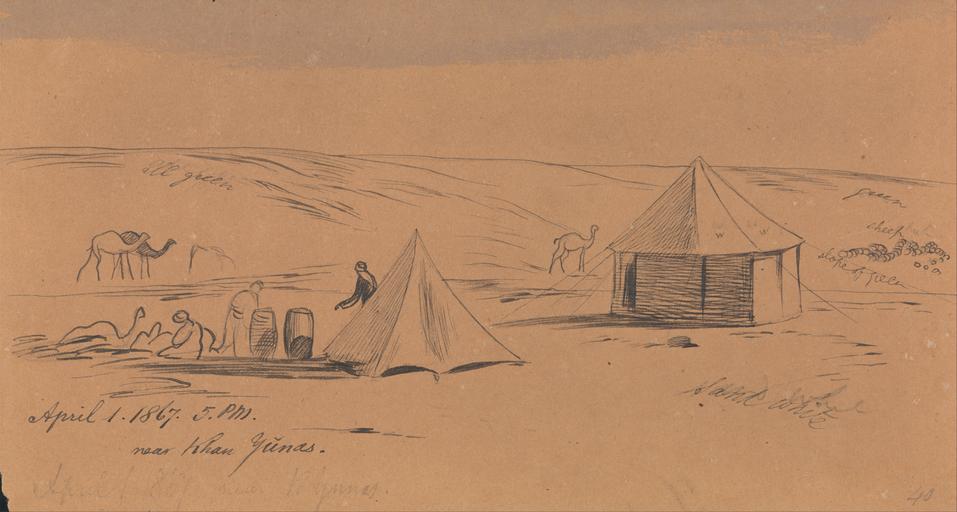 Keywords: Edward Lear - Near Khan Yunas - Google Art Project.jpg inscribed in black ink lower left April 1 1867 5 PM near Khan Yunas ; in graphite lower right Sand white 40 ; Verso in graphite upper left 176 up ; in graphite middle Lowest Not on View Watercolor with pen in black ink over graphite on medium slightly textured brown wove paper camels mammals tents hill barrels containers figures representations landscape special url_id YwE21KEvn2Xw7A PD-old-100-1923 1888 Drawings by Edward Lear Google Art Project works by Edward Lear Khan Yunis |