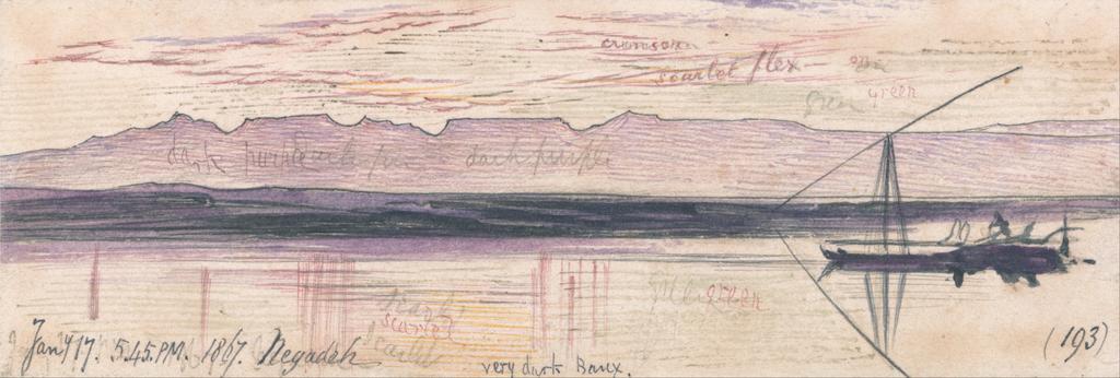 | Keywords: Edward Lear - Negadeh - Google Art Project.jpg inscribed in black ink lower left Jany 17 5 45 PM 1867 Negadeh; in black ink lowr right 193 ; Verso in graphite center 8 up \ Lowest right ; in graphite upper right 147 Not on View Watercolor with pen in black ink and cochineal over graphite on thick slightly textured beige wove paper sky water river riverbank landscape marine art boat special url_id JgH-ih_qej1niQ PD-old-100-1923 1888 Egypt by Edward Lear Google Art Project works by Edward Lear Egyptian feluccas in art |