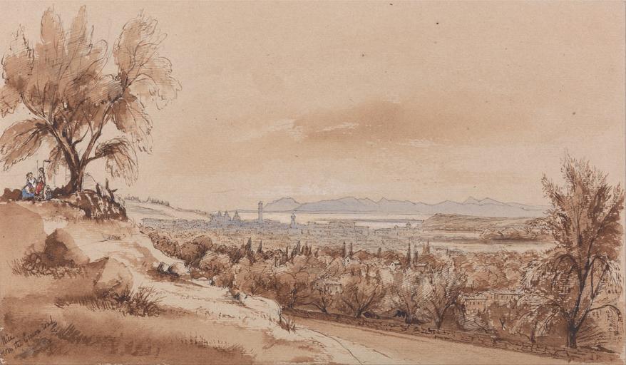 Keywords: Edward Lear - Nice from the Genoa Road - Google Art Project.jpg Inscribed in pen with brown ink lower left Nice from the Genoa Road Not on View Watercolor with pen in brown ink over graphite on medium slightly textured beige wove paper sky water grass mountains trees road cityscape figures representations landscape special url_id bQEA7B0N3UCRAg PD-old-100-1923 1888 Watercolor paintings by Edward Lear Google Art Project works by Edward Lear