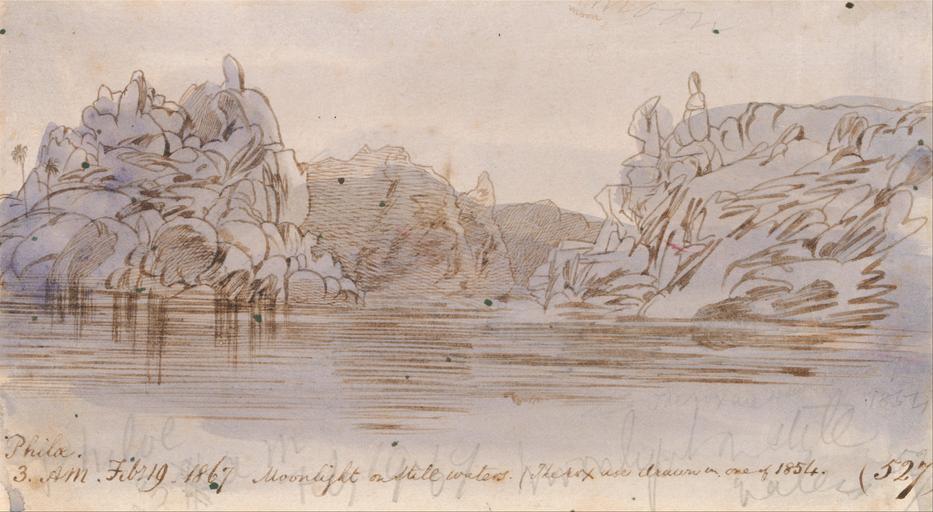 | Keywords: Edward Lear - Philae - Google Art Project (2431211).jpg inscribed in brown ink lower left Phila 3 AM Feby 19 1867 Moonlight on still waters the rox are drawn on one of 1854 527 Verso in graphite center 147 longwise middle line left Not on View Watercolor with pen in brown ink over graphite on medium slightly textured cream wove paper rocks water river hills island landscape special url_id SAHRV55py05sdA PD-old-100-1923 1888 Egypt by Edward Lear Philae in art Google Art Project works by Edward Lear |