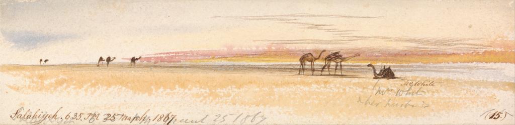 Keywords: Edward Lear - Salahiyeh - Google Art Project (2314769).jpg inscribed in brown ink lower left Salahiyeh 6 35 PM 25 March 1867 ; in brown ink lower right 15 ; Verso in graphite upper right 356 Not on View Watercolor with pen in brown ink over graphite on wove paper on thick rough cream wove paper sky camels mammals sand landscape special url_id 1gEbyReaQcD-6Q PD-old-100-1923 1888 Egypt by Edward Lear Google Art Project works by Edward Lear History of Syria |