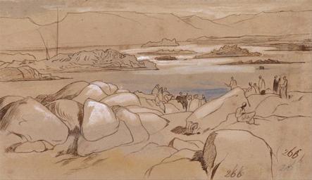 | Keywords: Edward Lear - Shelaal - Google Art Project (2418553).jpg inscribed in brown ink lower right 266 ; Verso in graphite center 29 Jan '67 Not on View Watercolor with pen in brown ink and gouach over graphite on medium slightly texture wove paper mounted on thick moderately textured cream wove paper rocks water river riverbank figures representations landscape boats special url_id hgH40QjwQXmgDw PD-old-100-1923 1888 Egypt by Edward Lear Google Art Project works by Edward Lear | ||||