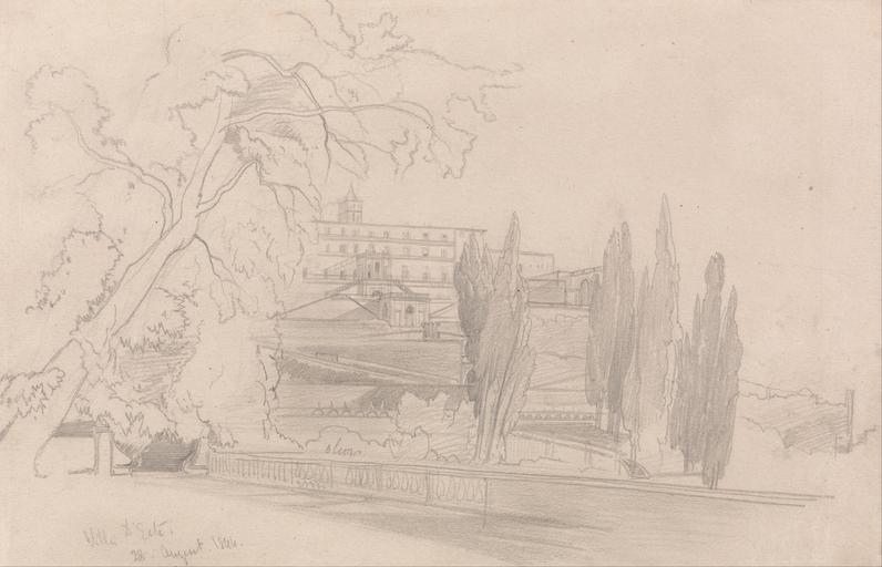 Keywords: Edward Lear - Villa d'Este - Google Art Project.jpg Inscribed in graphite lower left Villa d' Este 28 August 1844 ; Verso in graphite lower left Edward Lear ; in graphite center right 17/425 Not on View Graphite on moderately thick slightly textured gray wove paper architectural subject stone wall windows steps trees building fence landscape special url_id NAH97n7FrBUnSQ PD-old-100-1923 1888 Drawings by Edward Lear Google Art Project works by Edward Lear Collections of the Yale Center for British Art |