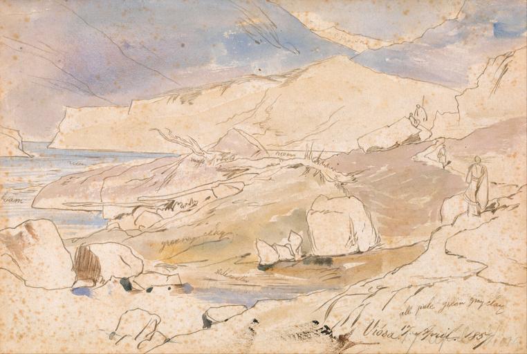 Keywords: Edward Lear - Vjosa - Google Art Project.jpg Inscribed in brown ink lower right Viosa 17 April 1857 Not on View Watercolor with pen in brown ink over graphite on medium slightly textured cream wove paper mounted on very thick moderately textured beige wove cardboard paper sky rocks water figures representations landscape special url_id JgEaO31woq2gSw PD-old-100-1923 1888 Paintings by Edward Lear Google Art Project works by Edward Lear
