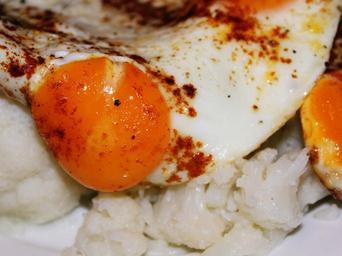 Keywords: egg yolk fried cauliflower lunch abendbrot meal food warm spices eat tasty nutrition frisch kitchen protein close