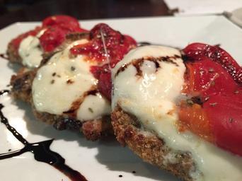 Keywords: eggplant baked mozzarella food dinner cuisine meal tomato dish vegetable cheese vegetarian lunch plate italian