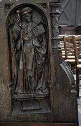 | Keywords: Eglise Orbais-l'Abbaye 2011 stalles jouee 4.jpg fr Stalles de l'église Saint-Pierre-et-Saint-Paul à Orbais l'Abbaye sculptées par Jean Huilier et offertes en 1520 par Louis de Bourbon abbé du couvent Une jouée Saint Jacques le Majeur own Vassil 2011-02-13 Cc-zero Choir stalls of abbatiale Saint-Pierre d'Orbais-l'Abbaye Reliefs of Saint James the Greater in France | ||||