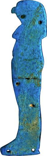 Keywords: Egyptian - Amuletic Figure of Kebehsenuef, Son of Horus - Walters 481638 - Reverse.jpg This faience amulet represents Kebehsenuef the hawk-headed son of Horus There are four sons of Horus and this amulet is part of a set of four Walters 48 1638-1641 The sons of Horus protected the vital organs of the body after mummification The image is that of a hawk-headed mummiform human The figure faces proper left It is composed of blue glazed faience with the details picked out in purple/black manganese The figure wears a three row broad collar and a tripartite wig There are five diagonal stripes of manganese across the mummiform body representing the mummy wrappings or braces A horizontal fracture separated the amulet about midway into two fragments which have since been reattached Numerous funerary amulets were usually placed among the many layers of linen strips used to wrap mummies Specific amulets along with their required position on the body are listed in funerary texts such as The Book of the Dead Amulets were sometimes sewn directly onto the wrappings or could be incorporated into a bead net shroud covering the mummy These amulets have been modeled with a flat underside and are pierced by tiny holes around the edges for attachment ca 750 650 BC Third Intermediate Egyptian faience with blue and black glaze cm 9 2 4 0 8 accession number 48 1638 28885 Henry Walters Baltimore date and mode of acquisition unknown Walters Art Museum Henry Walters Acquired by Henry Walters Jewelry - Ancient to Modern The Walters Art Gallery Baltimore 1979-1980 Objects of Adornment Five Thousand Years of Jewelry from the Walters Art Gallery Baltimore Cooper-Hewitt National Design Museum New York; Chrysler Museum of Art Norfolk; Carnegie Museum of Art Pittsburgh; San Antonio Museum of Art San Antonio; Philbrook Museum of Art Tulsa; Honolulu Academy of Arts Honolulu; New Orleans Museum of Art New Orleans; Milwaukee Art Museum Milwaukee; Minneapolis Institute of Arts Minneapolis; Toledo Museum of Art Toledo; The John and Mable Ringling Museum of Art Sarasota 1984-1987 Jewelry from the Walters Art Museum and the Zucker Family Collection The Walters Art Gallery Baltimore 1987 place of origin Egypt Walters Art Museum license Ancient Egyptian amulets in the Walters Art Museum Kebehsenuf Ancient Egyptian faience in the Walters Art Museum Media contributed by the Walters Art Museum needs category review