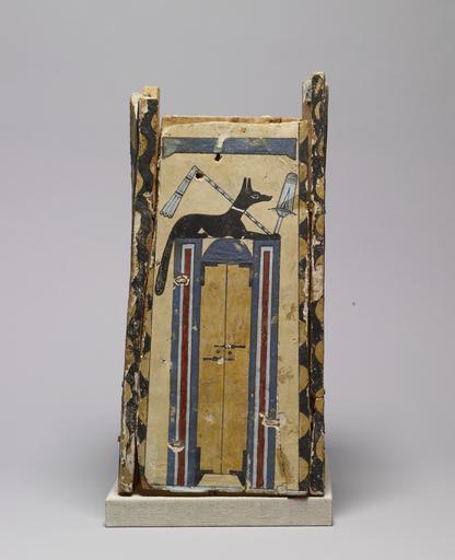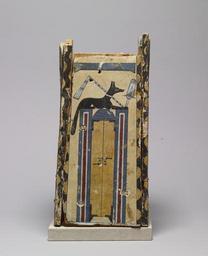 Keywords: Egyptian - Box for Ushabtis or Canopic Jars - Walters 626 - Side A.jpg During the New Kingdom ushabti figures were often placed in a painted wooden box shaped like a shrine Only the sides of this box are preserved and it may have held a number of ushabti figures or a set of canopic jars The deities associated with death and the afterlife are represented on the box's panels There is the figure of a jackal on top of a shrine which represents the embalming god Anubis Isis and Nephthys flank the large symbol of Osiris and the four sons of Horus All of the inscriptions are related to the god Osiris ca 850 700 BC Third Intermediate wood with paint cm 41 27 20 accession number 62 6 2451 Dr J Beekmans Holland Robert T Clough Keighley Yorkshire Walters Art Museum 1965 by purchase Museum purchase with funds provided by the S A P Fund 1965 In Search of Ancient Treasure 40 Years of Collecting The Walters Art Gallery Baltimore 1978 place of origin Egypt Walters Art Museum license Ancient Egyptian art in the Walters Art Museum Works of the Egyptian third intermediate period Ushabti box Recumbent canine hieroglyph |