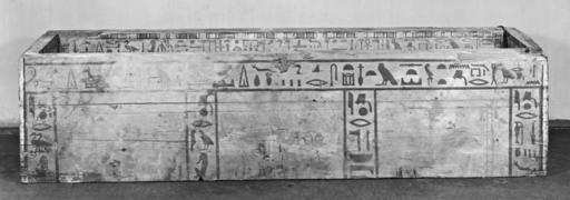 Keywords: Egyptian - Coffin of Rehu-er-djer-sen - Walters 625 - Profile.jpg This coffin made for a man named Rehu-er-djer-sen is an early form of burial container The exterior was left largely unpainted perhaps because it was made from expensive imported cedar wood The interior is painted with brightly colored objects and offerings considered essential to a wealthy burial Coffin Texts common to coffins of the early Middle Kingdom were written on the wood to help the owner gain access to the afterlife The texts are a series of magical spells intended to safeguard the body and spirit of the deceased and ensure resurrection Deities were also depicted from the myth of Osiris that guaranteed protection In the afterlife the individual was to travel the heavens with the sun-god Re Hieroglyphic inscriptions on the exterior of the coffin include a prayer to Osiris for funerary offerings Along the floor of the coffin flows the Nile of the underworld Rehu-er-djer-sen would have lain on his side so he might see the world through the eyes painted on the outside of the coffin ca 2000 1950 BC Middle Kingdom wood with polychrome cm 50 5 215 51 4 ; cover cm 7 62 51 1 216 accession number 62 5 30212 Lady Meux London date and mode of acquisition unknown William Randolf Hearst California date and mode of acquisition unknown Joseph Brummer New York date and mode of acquisition unknown Brummer Estate Sale New York 1949 pt II no 70 Walters Art Museum 1949 by purchase Museum purchase 1949 The inscriptions contain offering formulas spells of the coffin texts and names the owner Rehu-er-djer-sen In Search of Ancient Treasure 40 Years of Collecting The Walters Art Gallery Baltimore 1978 place of origin Egypt Walters Art Museum license Ancient Egyptian sarcophagi in the Walters Art Museum Sarcophagi of the Egyptian Middle Kingdom Sancturay hieroglyph Quail chick hieroglyph |