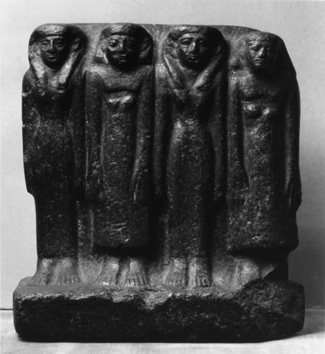 | Keywords: Egyptian - Family Group of Four - Walters 22311.jpg This statue is carved in very high relief It depicts two males and two female figures with their hands at their sides There may be traces of inscriptions on their dresses The corner of the base is broken off between 1800 1700 BC Middle Kingdom black granite cm 20 3 accession number 22 311 15737 Dikran Kelekian New York and Paris date and mode of acquisition unknown Henry Walters Baltimore 1923 mode of acquistion unknown Walters Art Museum Henry Walters Acquired by Henry Walters 1923 Number On old label 32 In the Fullness of Time Masterpieces of Egyptian Art from American Collections Hallie Ford Museum of Art Willamette University Salem; Boise Museum of Art Boise 2002-2003 place of origin Egypt Walters Art Museum license Ancient Egyptian reliefs in the Walters Art Museum Reliefs of the Egyptian Middle Kingdom |