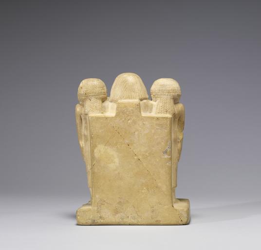 Keywords: Egyptian - Family Group of Three - Walters 22349 - Back.jpg This piece is a Middle Kingdom limestone triad consisting of a central male figure flanked by two women The central position of the male figure illustrates his elevated status over the women It is assumed that the people are all related but the exact relationships are uncertain due to the incomplete state of the inscription The statue is inscribed on the base with a brief standard offering formula and the names of two of the individuals All three figures have long arms and rather wide feet They all share the same idealized facial features including heavy hooded eyes and mouths that droop down at the corners The brow lines are quite straight and the foreheads are broad These features echo the severity seen in royal portraiture of the time The male figure wears a long wrapped garment which is tied at his waist He stands with his left foot forward and his arms hang straight with both hands flat upon the fronts of his thighs His striated wig pushes his large ears forward Both women stand with their feet together and their hands rest flat against the sides of their thighs They wear ankle length sheath gowns cut below the breasts with two wide shoulder straps Their tripartite wigs are plaited and gathered at the back of the head The wig lappets fall over the shoulders and curl outward at the ends in imitation of the wig worn by the goddess Hathor The front left corner of the base is missing A major crack cuts diagonally across the feet of the figures The surface of the base is slightly raised beneath the feet of the male figure Statue groups representing families in various combinations or sequences were a common theme in ancient Egyptian art Whereas in Old Kingdom statues the sizes of the individuals signaled their relative importance and their relationship Middle Kingdom statue groups are characterized by more naturalistic depictions This sculpture is further characteristic of Middle Kingdom group statuary with its back support emphasized hands and feet large ears and heavy wigs ca 1850 1800 BC Middle Kingdom carved limestone cm 20 15 1 8 7 accession number 22 349 35311 Dikran Kelekian New York and Paris Henry Walters city Baltimore Walters Art Museum 1931 by bequest Acquired by Henry Walters 1931 Translation A mortuary offering granted by the king and composed of bread beer oxen and fowl for the Ka i e the creative and sustaining life power of -Sobek born of Dedet-Sobek and for Aw born of Senet place of origin Egypt Walters Art Museum license Ancient Egyptian statuettes in the Walters Art Museum Statues of the Egyptian Middle Kingdom |
