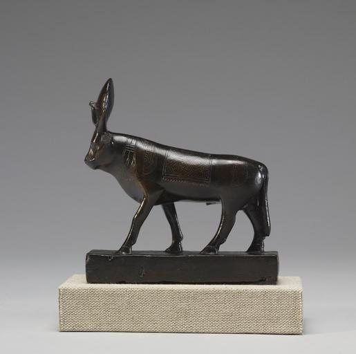 | Keywords: Egyptian - Figure of the Apis Bull - Walters 54538 - Left.jpg The Apis bull was associated with the creator god Ptah and with the rituals for the king His main place of worship was Memphis After the death of the Apis bull he was mummified and buried in a special cemetery Figures of Apis bulls were donated during the Late and Greco-Roman periods into temples This bronze figure displays the bull on a base He has a sun-disk between his horns combined with a uraeus cobra serpent The carving on its body displays a collar a winged sun-disk on the shoulders and a cloth with a hatched pattern on the back ca 600 500 BC Late Period bronze cm 12 07 11 43 accession number 54 538 22399 Henry Walters Baltimore date and mode of acquisition unknown Walters Art Museum Henry Walters Acquired by Henry Walters Translation The Apis the Horus giving life to Pesometik son of Pedy-wesr made of Neb-hetef Egypt in Africa Indianapolis Museum of Art Indianapolis 1996 place of origin Egypt Walters Art Museum license Ancient Egyptian statuettes in the Walters Art Museum Statues of Apis Media contributed by the Walters Art Museum needs category review |