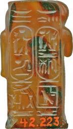 Keywords: Egyptian - Goddess and Ramesses II - Walters 42223 - Reverse.jpg This is a small statuette of Pharaoh Ramesses II and a goddess made of carnelian Both the goddesses Hathor and Isis are mentioned in the inscription on the back pillar The piece is inscribed in two columns of text on the back pillar and the cartouche of the Ramesses II inscribed under the base The two figures stand against a wide back pillar on a low base The goddess stands on the proper left with her arm around the shoulders of the king The right half of her face and her left foot have been broken away She wears a low modius crown tripartite wig and a sheath gown which is trimmed at the ankle and belted at the waist The top of the king's head is level with the top of the crown of the goddess He is depicted as a youth with a side lock and the index finger of his right hand raised to his lips He wears a pleated mid-calf length shendyt with a pendulous sash Both figures are adorned with a uraeus bracelets and armbands Although the face is quite small the typical smiling mouth of Ramesses II is visible ca 1279 1212 BC New Kingdom carnelian cm 4 2 2 15 0 51 ; Mount cm 0 53 3 23 1 83 accession number 42 223 7815 Henry Walters Baltimore date and mode of acquisition unknown Walters Art Museum Henry Walters Acquired by Henry Walters Transcription rameses mery-amun; Translation Rameses Beloved of Amun; Translation Lord of the Two Lands User-maat-re Setep-en-re Beloved of the Great One of Magic an epithet of Isis Lord of the Diadems Rameses Mery-amun Beloved of Hathor place of origin Egypt Walters Art Museum license Ancient Egyptian amulets in the Walters Art Museum Cartouches of Ramses II Hathor symbol hieroglyph |