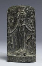 | Keywords: Egyptian - Horus-Stele - Walters 22332.jpg The Horus-stele or 'cippus ' was one of the most important items associated with magic in ancient Egypt At the center of these stone slabs was the nude figure of the child Horus or Harpocrates associated with the newborn sun with the head of the god Bes above him Horus-the-Child the son of Isis stands on two crocodiles and holds dangerous animals snakes scorpion lion and antelopes in his hands demonstrating that with supernatural powers even a child can overcome dangers Texts and magical scenes occupy most of the empty space Larger examples of these Horus-steles were placed in temple precincts where priests poured water over them to absorb the magical power of the spells and images Drinking the water it was believed would protect against the harmful bites of dangerous creatures as well as other dangers and evils Smaller versions were used at home and very small ones were worn as amulets century 3 BC Greco-Roman dark grey serpentine cm 16 5 accession number 22 332 24712 Dikran Kelekian New York and Paris by purchase Henry Walters city Baltimore Walters Art Museum Henry Walters Acquired by Henry Walters 1923 Thou Shalt Have No Other Gods Before Me The Jewish Museum New York 1964 Daily Magic in Ancient Egypt The Walters Art Museum Baltimore 2006-2007 place of origin Egypt Walters Art Museum license Ancient Egyptian reliefs in the Walters Art Museum Cippus of Horus Amulets of Greco-Roman Egypt |