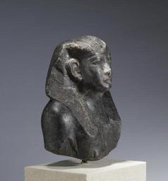 Keywords: Egyptian - King - Walters 22351 - Three Quarter Right.jpg Both continuity and change are reflected in this portrait bust initially carved for a ruler of the Middle Kingdom and then re-carved for a New Kingdom monarch There was a marked change between the way late 12th Dynasty and mid 19th Dynasty kings were represented The pharaohs of the 12th Dynasty wished to present an experienced and careworn expression This is conveyed by heavy eyelids wrinkles and a firm set to the mouth The pharaohs of the 19th Dynasty however wanted their images to suggest youth vigor and confidence To transform a Middle Kingdom royal image into a New Kingdom one sculptors re-carved the face The eyes nose and forehead of this sculpture show evidence of reworking to erase signs of age while the corners of the mouth were deeply drilled to make the cheeks appear rounder and to bring the lips closer to the slight smile typical of 19th Dynasty royal sculpture Original work ca 1872-1806 BC ; Reworking ca 1250 BC Middle Kingdom; New Kingdom anorthosite gneiss cm 22 18 5 11 accession number 22 351 2362 Dikran Kelekian New York and Paris Henry Walters city Baltimore Walters Art Museum Henry Walters Acquired by Henry Walters 1912 Egypt in Africa Indianapolis Museum of Art Indianapolis 1996 place of origin Egypt Walters Art Museum license Ancient Egyptian statues in the Walters Art Museum Unknown pharaohs Media contributed by the Walters Art Museum needs category review