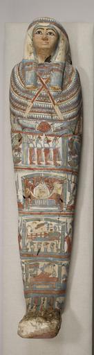 Keywords: Egyptian - Mummy and Painted Cartonnage of an Unknown Woman - Walters 791.jpg Mummification preserved mortal remains in order to house the Ka or life force of the individual as it needed to return to the body to find sustenance The human-shaped covering called cartonnage is composed of layers of linen and plaster Its painted decoration includes the floral wreath on the wig a broad collar and a winged scarab beetle Five additional registers of decoration show the protective four sons of Horus the sacred boat of the funerary-deity Sokar a mummy of Osiris on a funerary bed a divine falcon god and a short hieroglyphic text with an offering formula See the additional media for a facial reconstruction of the mummy courtesy of Michael Brassell as well as a color reconstruction of the cartonnage ca 850 750 BC Third Intermediate mummy in cartonnage with paint cm 167 46 27 5 accession number 79 1 492 Excavated at Deir el-Bahri by the Metropolitan Museum of Art's Egyptian Expedition Winter of 1930-1931 by Ambrose Lansing Metropolitan Museum of Art New York ca 1930-1931 Walters Art Museum 1941 by exchange Museum acquisition by exchange with the Metropolitan Museum of Art 1941 Translation The king gives an offering to Osiris In Search of Ancient Treasure 40 Years of Collecting The Walters Art Gallery Baltimore 1978 Highlights from the Collection The Walters Art Gallery Baltimore 1998-2001 place of origin Deir el-Bahri present-day Western Thebes Egypt Walters Art Museum license Ancient Egyptian sarcophagi in the Walters Art Museum Ancient Egyptian art from Deir el-Bahari Sarcophagi of the Egyptian third intermediate period Media contributed by the Walters Art Museum needs category review Egyptian mummies in the Walters Art Museum |
