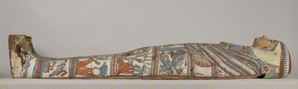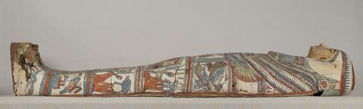 Keywords: Egyptian - Mummy and Painted Cartonnage of an Unknown Woman - Walters 791 - Left Side.jpg Mummification preserved mortal remains in order to house the Ka or life force of the individual as it needed to return to the body to find sustenance The human-shaped covering called cartonnage is composed of layers of linen and plaster Its painted decoration includes the floral wreath on the wig a broad collar and a winged scarab beetle Five additional registers of decoration show the protective four sons of Horus the sacred boat of the funerary-deity Sokar a mummy of Osiris on a funerary bed a divine falcon god and a short hieroglyphic text with an offering formula See the additional media for a facial reconstruction of the mummy courtesy of Michael Brassell as well as a color reconstruction of the cartonnage ca 850 750 BC Third Intermediate mummy in cartonnage with paint cm 167 46 27 5 accession number 79 1 492 Excavated at Deir el-Bahri by the Metropolitan Museum of Art's Egyptian Expedition Winter of 1930-1931 by Ambrose Lansing Metropolitan Museum of Art New York ca 1930-1931 Walters Art Museum 1941 by exchange Museum acquisition by exchange with the Metropolitan Museum of Art 1941 Translation The king gives an offering to Osiris In Search of Ancient Treasure 40 Years of Collecting The Walters Art Gallery Baltimore 1978 Highlights from the Collection The Walters Art Gallery Baltimore 1998-2001 place of origin Deir el-Bahri present-day Western Thebes Egypt Walters Art Museum license Ancient Egyptian sarcophagi in the Walters Art Museum Ancient Egyptian art from Deir el-Bahari Sarcophagi of the Egyptian third intermediate period Egyptian mummies in the Walters Art Museum |