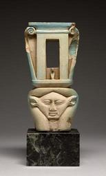 | Keywords: Egyptian - Naos-sistrum - Walters 48465.jpg  Depicted with cow features the goddess Hathor was associated with sexuality motherhood and music This sistrum or rattle is a masterwork of Egyptian faience which is particularly fitting as Hathor was also known as mistress of faience ca 580 525 BC Late Period Egyptian faience with glaze cm 15 4 7 8 3 6 ; mount cm 4 5 7 3 5 8 accession number 48 465 18835 Henry Walters Baltimore date and mode of acquisition unknown Walters Art Museum Henry Walters Acquired by Henry Walters Mistress of House Mistress of Heaven Women in Ancient Egypt Brooklyn Museum Brooklyn; Cincinnati Art Museum Cincinnati 1996-1997 place of origin Tarentum present-day Taranto Italy Walters Art Museum license Ancient Egyptian art in the Walters Art Museum Sistrum in art Media contributed by the Walters Art Museum needs category review |