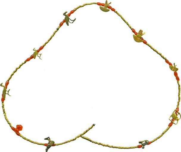 | Keywords: Egyptian - Necklace - Walters 571515.jpg This restrung necklace consists of biconical carnelian beads beads of rolled strips of sheet gold and ten amulets The rooster and couchant animal at either end of the necklace cast of a pale yellow metal probably do not belong Below the rooster at left is a tiny heart amulet of carnelian The other amulets are cut out of sheet gold of varying thickness and have rolled sheet gold loops attached to the back Below the couchant animal at right is an amulet showing a man holding palm branches which symbolized millions of years The six remaining figures are hieroglyphs as well The three birds at left probably represent the sacred ibis of the god Thoth although the long body of one and thick bill of another seem more appropriate to ducks Two amulets show the double crown resting on a basket which signified royal power in Upper and Lower Egypt Another basket amulet has something protruding from it between 2000 1600 BC Middle Kingdom gold and carnelian beads Bird cm 0 67 0 38 ; Ib H 1/16 0 2 x 0 05 cm ; Ibis I cm 0 55 0 79 ; Ibis II cm 0 35 0 3 ; Vulture cm 0 48 0 31 ; Double Crown I cm 0 29 0 22 ; Double Crown II cm 0 56 0 43 ; Neb W 1/8 in 0 05 x 0 39 cm ; Heh cm 0 3 0 51 ; Animal W 1/16 in 0 04 x 0 23 cm accession number 57 1515 24820 Henry Walters Baltimore date and mode of acquisition unknown Walters Art Museum Henry Walters Acquired by Henry Walters Jewelry - Ancient to Modern The Walters Art Gallery Baltimore 1979-1980 place of origin Egypt Walters Art Museum license Ancient Egyptian jewellery in the Walters Art Museum |