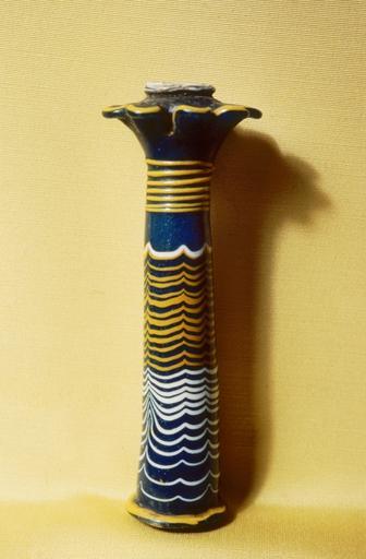 Keywords: Egyptian - Palm Column Kohl Tube - Walters 4741.jpg The Egyptian learned from their Near Eastern neighbors how to make glass At first they imported the raw material and processed it in Egypt but soon they learned how to produce it by themselves This core-formed glass kohl tube is datable to the 18th Dynasty Originally there would have been a long thin glass applicator for the kohl as well The palm column shape was quite common for glass kohl tubes The body of the vessel is composed of translucent bright turquoise colored glass and the surface polish is in excellent condition The flaring palm top is outlined in dark yellow glass and the opening of the vessel is outlined in opaque white glass The neck of the tube is decorated with six raised threads of glass The body is decorated with threads of yellow and white glass which have been dragged to form a festoon pattern The bottom of the tube is rounded and has a flared ridge around the edge Some of the core material is still visible inside ca 1450 1300 BC New Kingdom glass cm 11 3 9 h x diam accession number 47 41 7022 Henry Walters Baltimore 1914 mode of acquisition unknown Walters Art Museum Henry Walters Acquired by Henry Walters 1914 place of origin Malkata present-day Western Thebes Egypt Walters Art Museum license Ancient Egyptian art in the Walters Art Museum Ancient Egyptian kohl artifacts Palmiform columns Ancient Egyptian glassware Ancient Egyptian art from Malkata Kohl Vase |