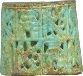 | Keywords: Egyptian - Ring with Horus and Hathor - Walters 481620 - View B.jpg A fragile openwork ring made of faience with designs in superimposed registers of plaques The god Horus represented as a hawk with disk on head one wing up one down foot forward alternates with heads of the cow-eared goddess Hathor In all but one plaque she wears a low crown In one she wears the characteristic heavy wig with spiral curls century 10 8 BC faience with blue glaze H 9/16 x W 7/8 x Outer Diam 9/16 in 1 42 x 2 2 x 1 5 cm accession number 48 1620 1457 Henry Walters Baltimore date and mode of acquisition unknown Walters Art Museum Henry Walters Acquired by Henry Walters Jewelry - Ancient to Modern The Walters Art Gallery Baltimore 1979-1980 place of origin Egypt Walters Art Museum license Ancient Egyptian jewellery in the Walters Art Museum Ancient Egyptian faience in the Walters Art Museum Media contributed by the Walters Art Museum needs category review |